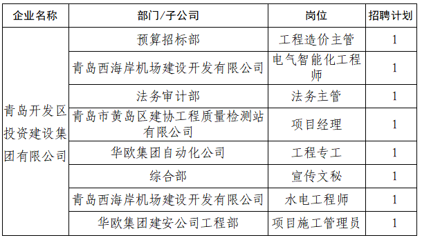 为满足集团业务发展需要,青岛开发区投资建设集团有限公司现面向社会公开招聘工作人员8名,具体招聘公告如下: